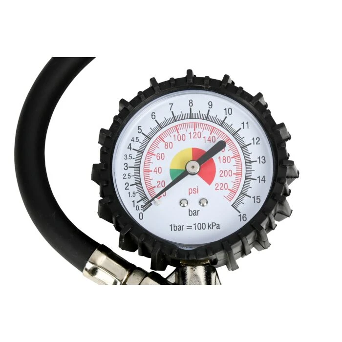 – Bandendrukmeter met manometer- Geschikt voor luchtcompressoren- Meetbereik: 0-16 BAR, 0-220 PSIGebruiksaanwijzing:1. Verwijder de ventieldop van de band.2. Klem de ventielhouder op het bandventiel. Zorg ervoor dat het goed vergrendeld is en voorkom dat er lucht ontsnapt.3. Lees de druk af die op de meter wordt weergegeven.Opmerking: als de bandenspanning te laag is moet de band opgepompt worden, als de bandenspanning te hoog is moet u de druk laten ontsnappen door op de resetknop van het ontluchtingsventiel te drukken.