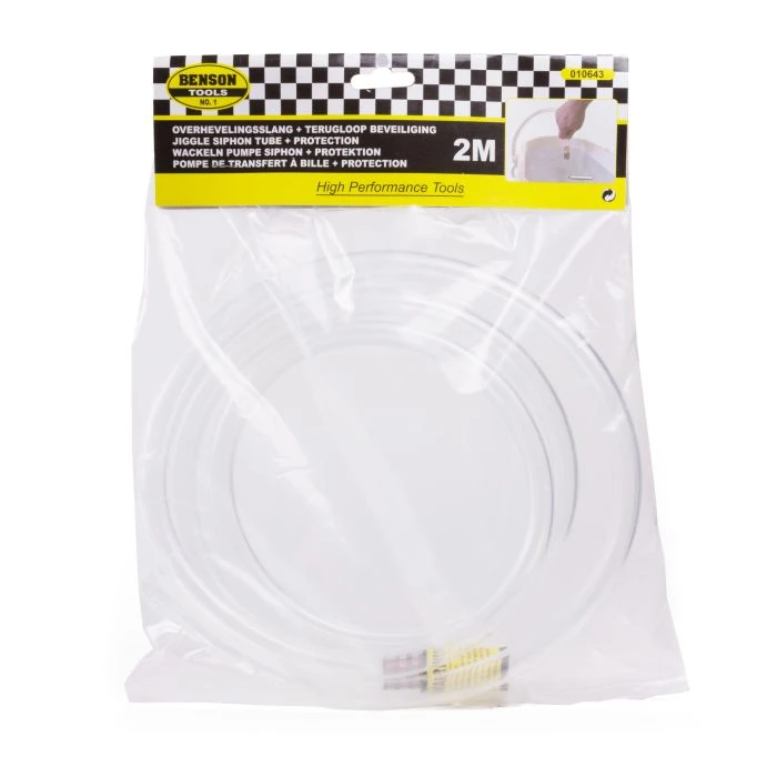 Voor het eenvoudig overhevelen van vloeistoffen Werkt met nagenoeg alle vloeistoffen zoals water, olie, reinigingsmiddelen etc. Capaciteit: 10 liter per minuut Lengte slang: 200 cm Met terugloopbeveiliging Niet geschikt voor benzine Gebruiksaanwijzing: Overhevel vloeistof altijd van hoog naar laag Plaats de uiteinde van de slang met het ventiel in de vloeistof Houdt vervolgens het uiteinde van de slang op de plek waar de vloeistof naar toe moet Schudt de slang een aantal keer op en neer tot de vloeistof gaat stromen