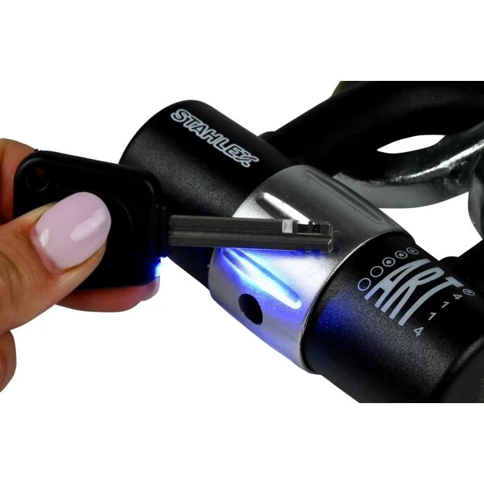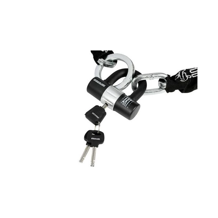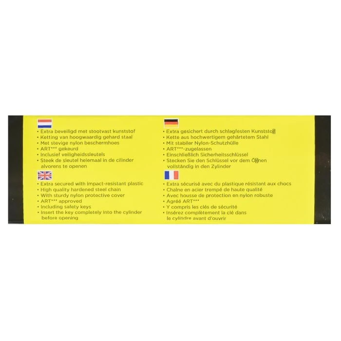 Bescherm je waardevolle tweewieler: Het Stahlex Kettingslot is de perfecte keuze om je bromfiets, snorfiets, scooter, poort of aanhanger te beveiligen. Dit slot is van de hoogste kwaliteit en voldoet aan de eisen van verzekeringsmaatschappijen. Met een lengte van 120 cm en een dikte van 10 mm biedt dit kettingslot optimale bescherming tegen diefstal. Gemaakt van gehard staal: Het Stahlex Kettingslot is vervaardigd uit hoog gehard staal, wat zorgt voor maximale duurzaamheid en stevigheid. De schakels en de hangslotbeugel zijn beide 10 mm dik, waardoor het slot bestand is tegen de meeste vormen van inbraakpogingen. Dit maakt het een betrouwbare keuze voor iedereen die zijn voertuig veilig wil stellen. Gebruiksvriendelijk en praktisch: Dit kettingslot is niet alleen robuust, maar ook praktisch in gebruik. De ketting is 120 cm lang, waardoor je je voertuig gemakkelijk kunt vastzetten aan een vast object. Bovendien wordt het slot geleverd met drie veiligheidssleutels, waarvan één is uitgerust met een blauw LED-lampje voor gebruiksgemak in het donker. De stevige canvas beschermhoes beschermt het slot tegen weersinvloeden, zodat het langer meegaat. ART*** 4114Het ART Keurmerk Opbouw van het Keurmerk Alleen sloten voor tweewielers die voldoen aan de gestelde eisen kunnen het Keurmerk krijgen. Er wordt dan een toelatingsnummer van 4 cijfers verleend. De sloten zijn ingedeeld in verschillende categorieën zoals de kettingsloten en ringsloten. Daarnaast wordt gewerkt met een sterrensysteem. Hoe meer sterren een slot heeft, hoe hoger de preventieve waarde van het slot en hoe beter hij dus beschermt tegen diefstal. Een slot met vijf sterren heeft de meeste preventieve waarde.Welk slot moet ik nu voor mijn tweewieler gebruiken? Over het algemeen geldt het volgende advies: 1 ster is minimale beveiliging (“meeneembeveiliging”) 2 sterren voor fietsen 3 sterren voor brom- en snorfietsen 4 sterren voor motorfietsen (onderweg)ART*** 4114