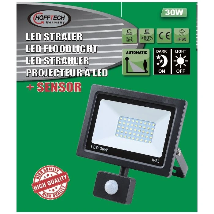 Energie-zuinige LED-straler met bewegingsmelder.SPECIFICATIES:o Aluminium behuizing met transparant glaso Voorzien van een sensor met timer, sensor en lux instelbaaro45 SMD-LED’so Vermogen: 30 Wo Stroomsterkte: 0,145 Ampèreo Lichtopbrengst: 2100 lumeno Lichtkleur: 6000K (wit)o IP-klasse: IP65 (weerresistent)o Afmetingen: 173x195x60mmo Gewicht: 566 gramo Lengte kabel: 25 cm