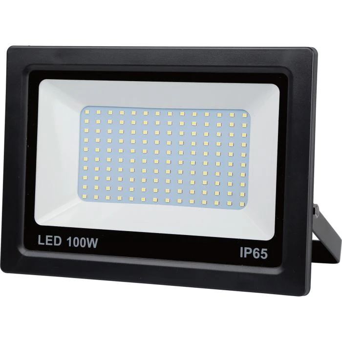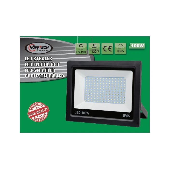 Energie-zuinige LED-straler.SPECIFICATIES:o Aluminium behuizing met transparant glaso140 SMD-LED’so Vermogen: 100 Wo Stroomsterkte: 0,402o Lichtopbrengst: 7000 lumeno Lichtkleur: 6000K (wit)o IP-klasse: IP65 (weerresistent)o Afmetingen: 262x189x50 mmo Gewicht: 1335 gramo Lengte kabel: 25 cm