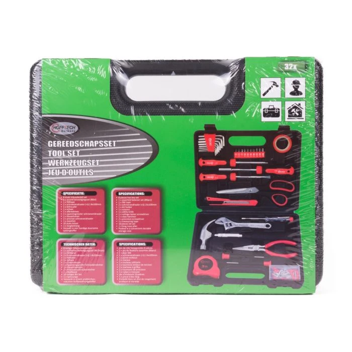 Specificatie:8 stuks inbusssleutel set1 x assorti bevestigingsset (80st)1 x 5Mtape2 x schroevendraaier (+)(-) 6x100mm1 x bithouder1 x schaar1 x afbreekmes1 x spanningstester schroevendraaier1 x klauwhamer2 x precisie schroevendraaier1 x meetlint10 stuks bitset1 x langbektangVerpakt in een handige duurzame opbergkoffergewicht 1700 gr