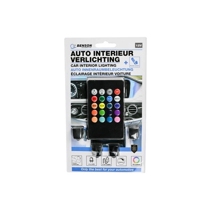 – Auto interieur verlichting- Inclusief afstandsbediening- Dimbaar- Maakt je auto een stuk sfeervoller- Inclusief dubbelzijdige tape- Lengte snoer: 2 meter- Ingang: 12V, 1A- Kleur: 16 kleuren- Incl. 1 x CR2025 batterij (afstandsbediening)Dit product kan optische verstoringen creëren voor de bestuurder en andere weggebruikers. Niet gebruiken tijdens het rijden. Uitsluitend voor gebruik in de auto. Bevestig het altijd onder ruithoogte en op plekken waar geen direct of indirect licht naar buiten zichtbaar is.