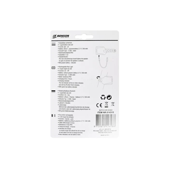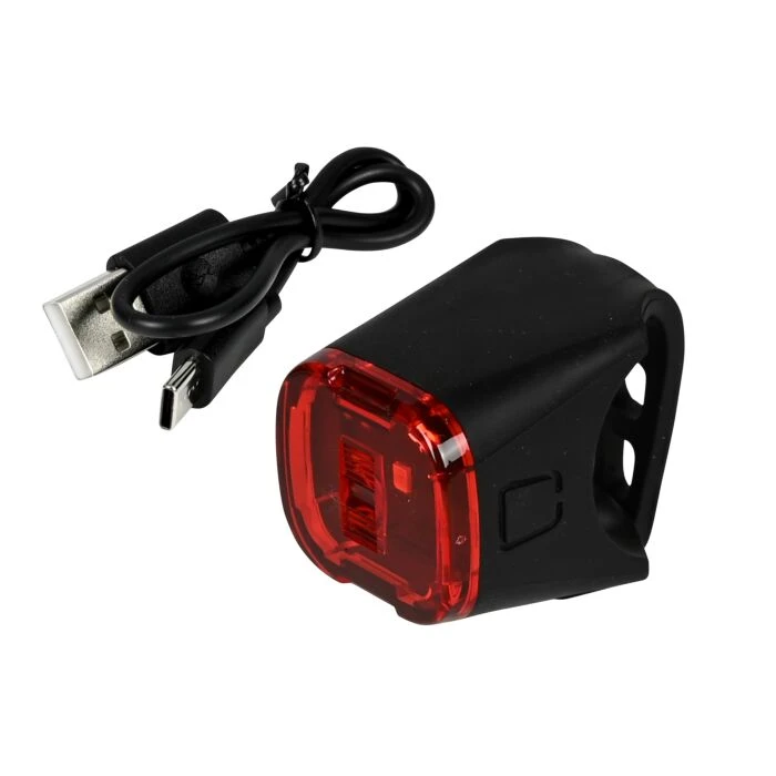 Oplaadbaar fiets achterlicht1 superheldere rood LEDFunctie:aan / uitBatterij: lithiumpolymeer 3,7 V/550 mAhInclusief USB-C kabelWaterbestendigOplaadtijd 2,5 uur