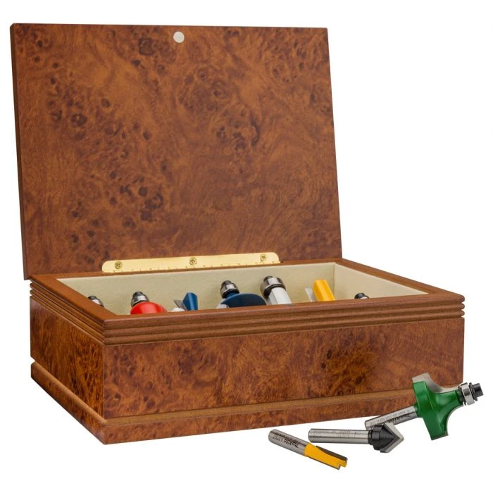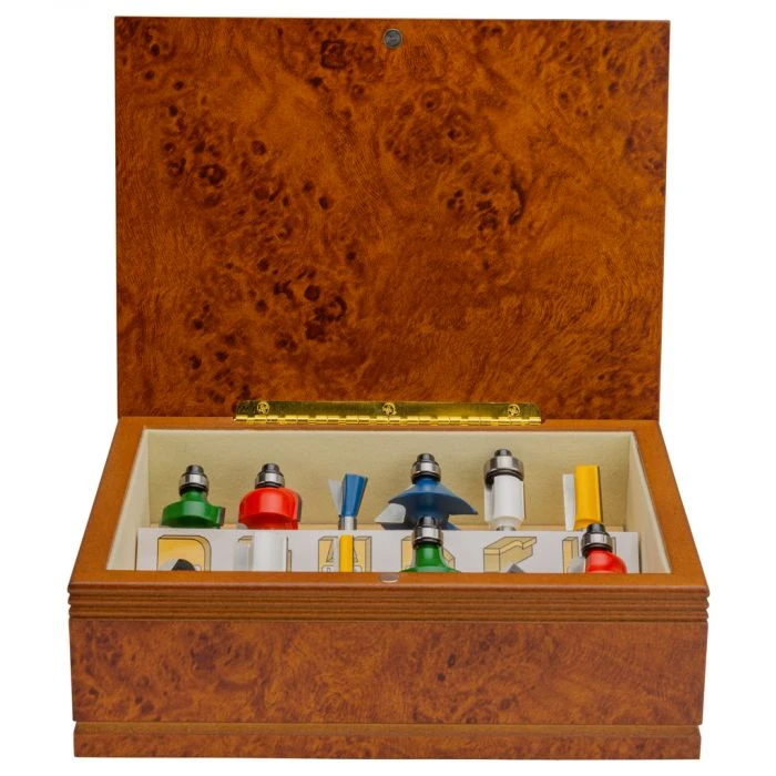 De set bestaat uit een kopieerfrees, zwaluwstaartfrees, 3x groeffrees, 3x kantenfrees, holprofielfrees, V-groeffrees en 2x profielfrees.