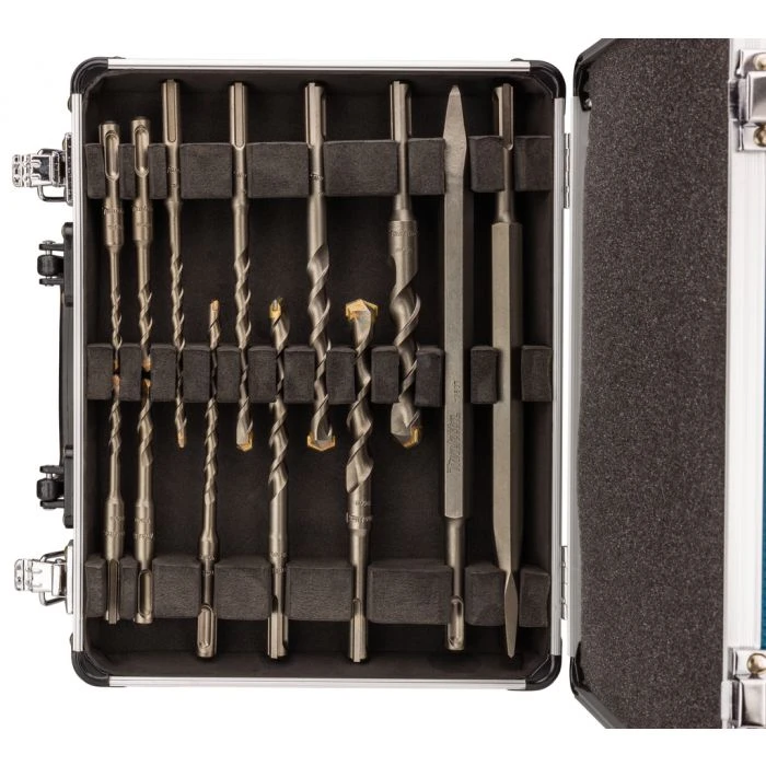 De set bestaat uit 4x betonboren 110mm in diameters 5-8mm, 7x betonboren 160mm in diameters 6-16mm, puntbeitel 250mm en een platbeitel 25x250mm.