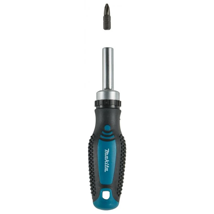 Ratelschroevendraaier inclusief schroefbit PH2x25mm, met 3 standen: linksom, rechtsom of geblokkeerd. Tevens geschikt voor alle andere Makita 1/4″ zeskant schroefbits. Voorzien van anti-slip handgreep.