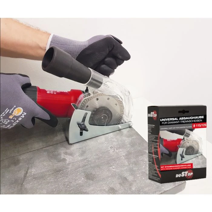 DUSTOP stofafzuigkap geschikt voor alle gangbare haakse slijpers, deze kap is geheel transparant hierdoor behoud u veel zicht op het werkstuk.