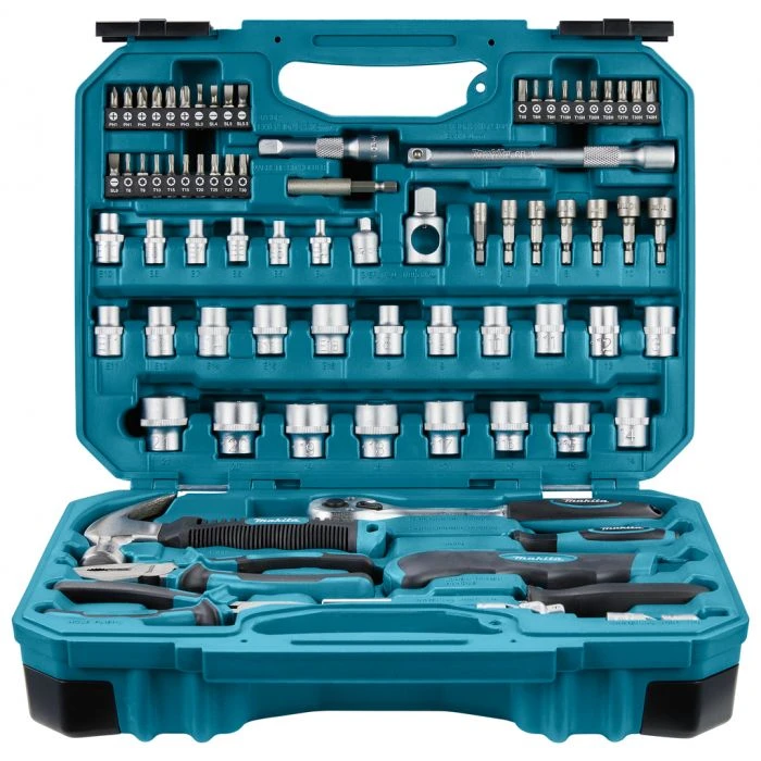 Deze 76-delige Makita handgereedschapset in kunststof koffer bestaat onder andere uit een 30-delige schroefbitset, 25-delige doppenset, 3/8″ ratel, hamer, combinatietang, punttang, bitschroevendraaier, dopschroevendraaier en afbreekmes.