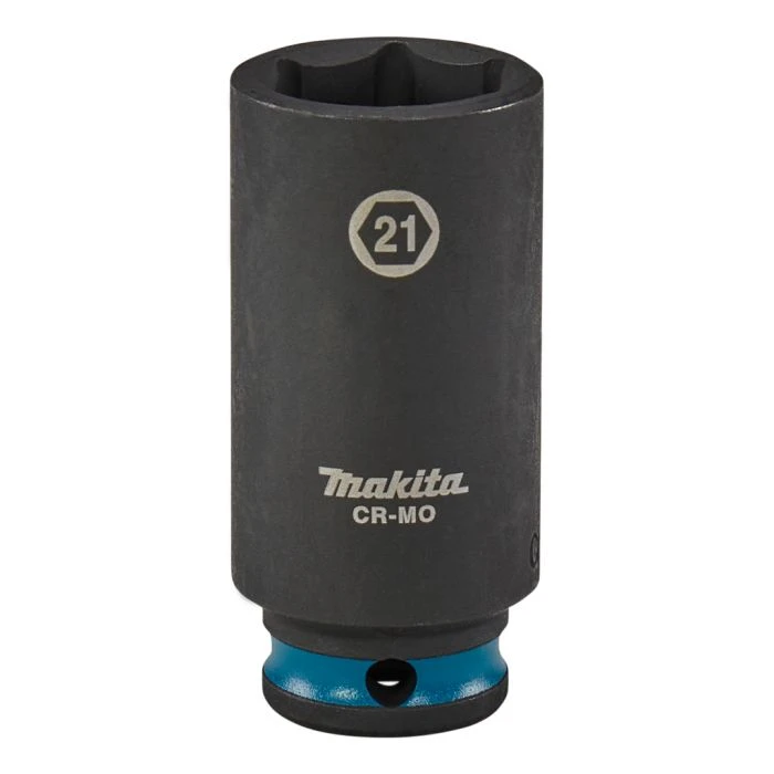 Extra lange Makita 21mm krachtdop uit de Impact Black serie, met 3/8″ VK aansluiting met een werklengte van 63mm; perfect voor lastig bereikbare plaatsen. Deze dop is vervaardigd uit Chroom-Molybdeen, heeft een nauwkeurige passing en een lange levensduur. Voorzien van een Makita-teal gekleurde band en maataanduiding.