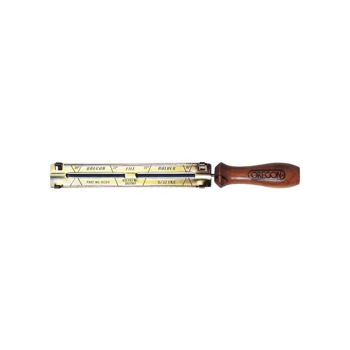 Gereedschap voor het vijlen van een zaagketting. De op de houder aangebrachte lijnen maken het gemakkelijk om de vijl altijd in de juiste positie te houden voor de vereiste bovenplaathoek op de beiteltanden van de zaagketting. Houdt de vijl altijd op de juiste diepte en klemt de vijl stevig vast. Met houten handvat.