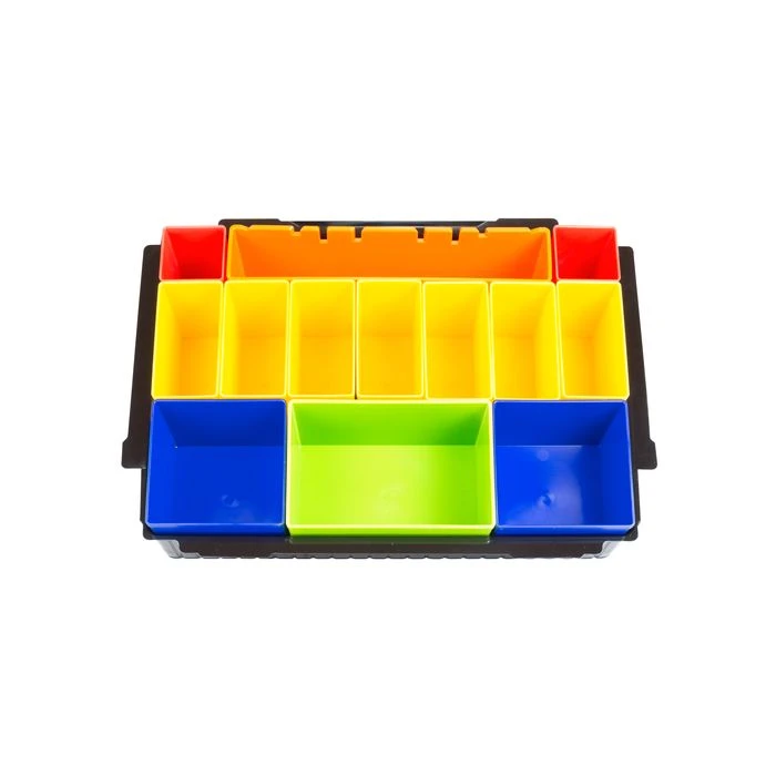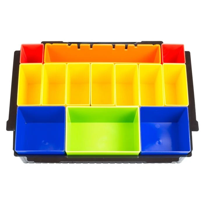 Set gekleurde inzetbakken voor Mbox1. Ideaal voor het opbergen van bits, schroeven, moeren en bouten. Deze bakken zijn enkel geschikt voor Mbox 1.De afmeting van de bakken (binnenwerk LxBxH):Rood – 45x45x68 mmOranje – 42x239x68 mmGeel – 93x45x68 mmBlauw – 93x94x68 mmGroen – 93x141x68 mmWordt geleverd met het noppenfoam voor in het deksel, zoals getoond op de afbeeldingen.